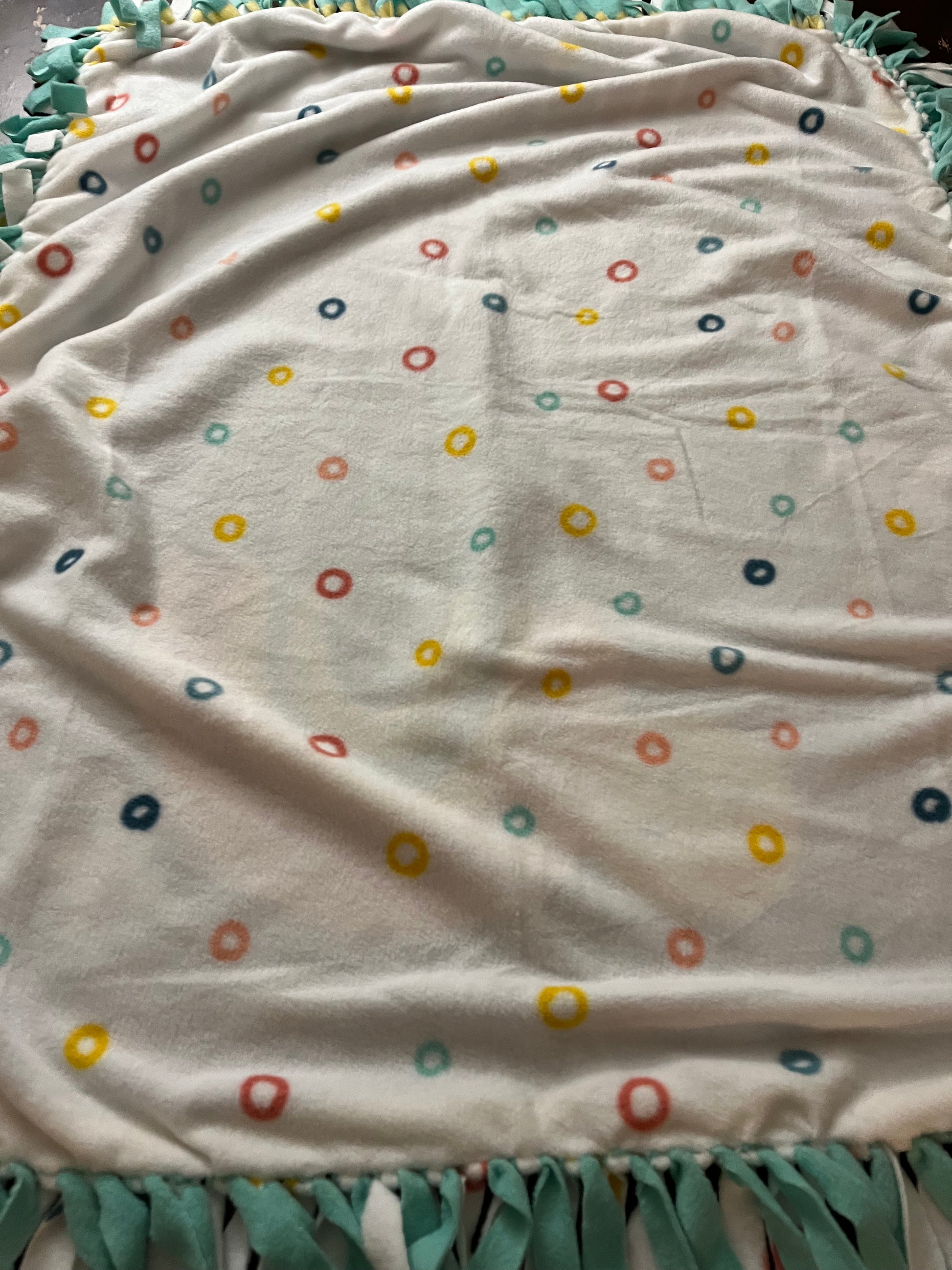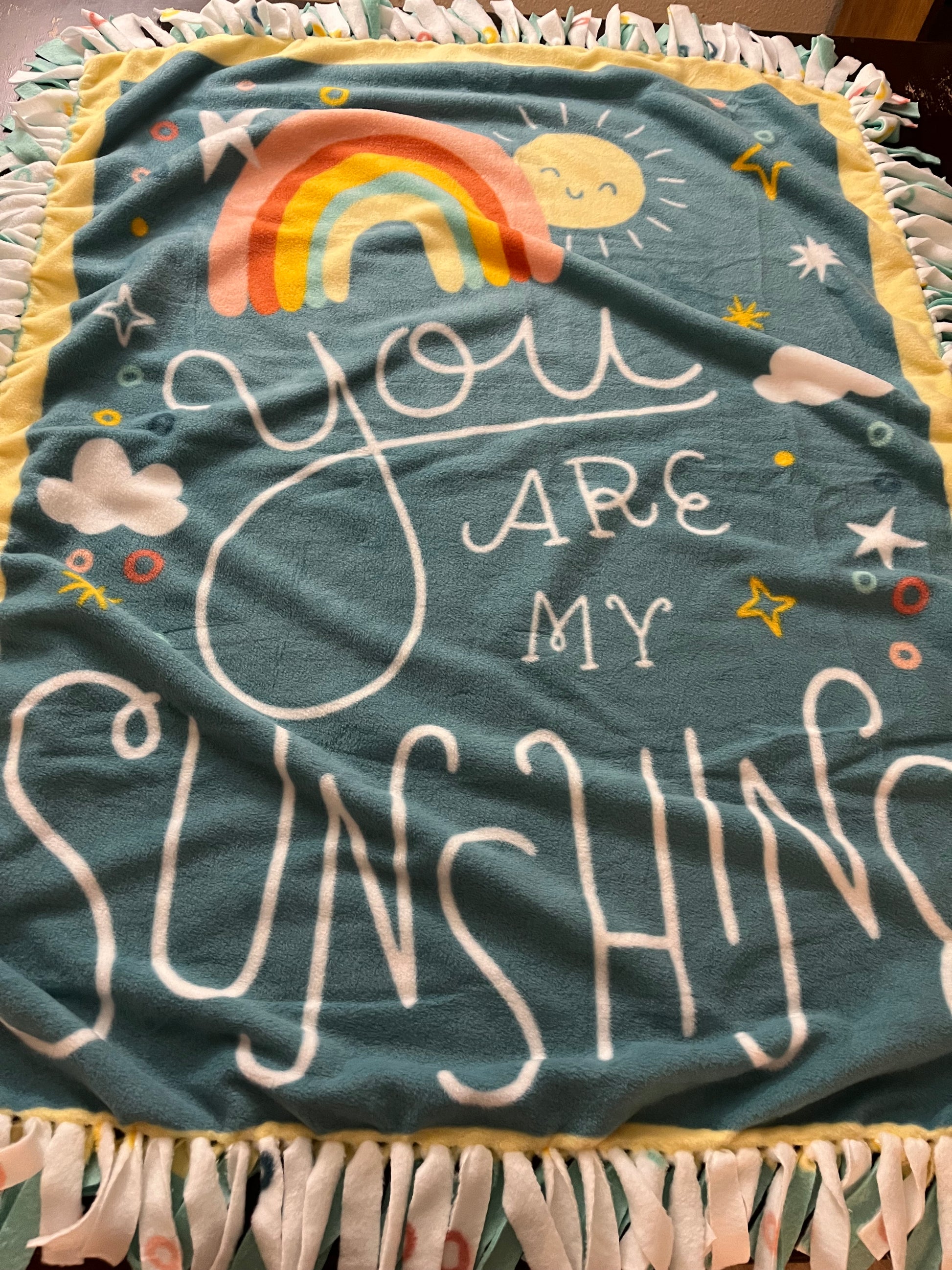 Blanket has 2 layers of fleece: Main picture ( You are my sunshine) other side is: white with colored circles