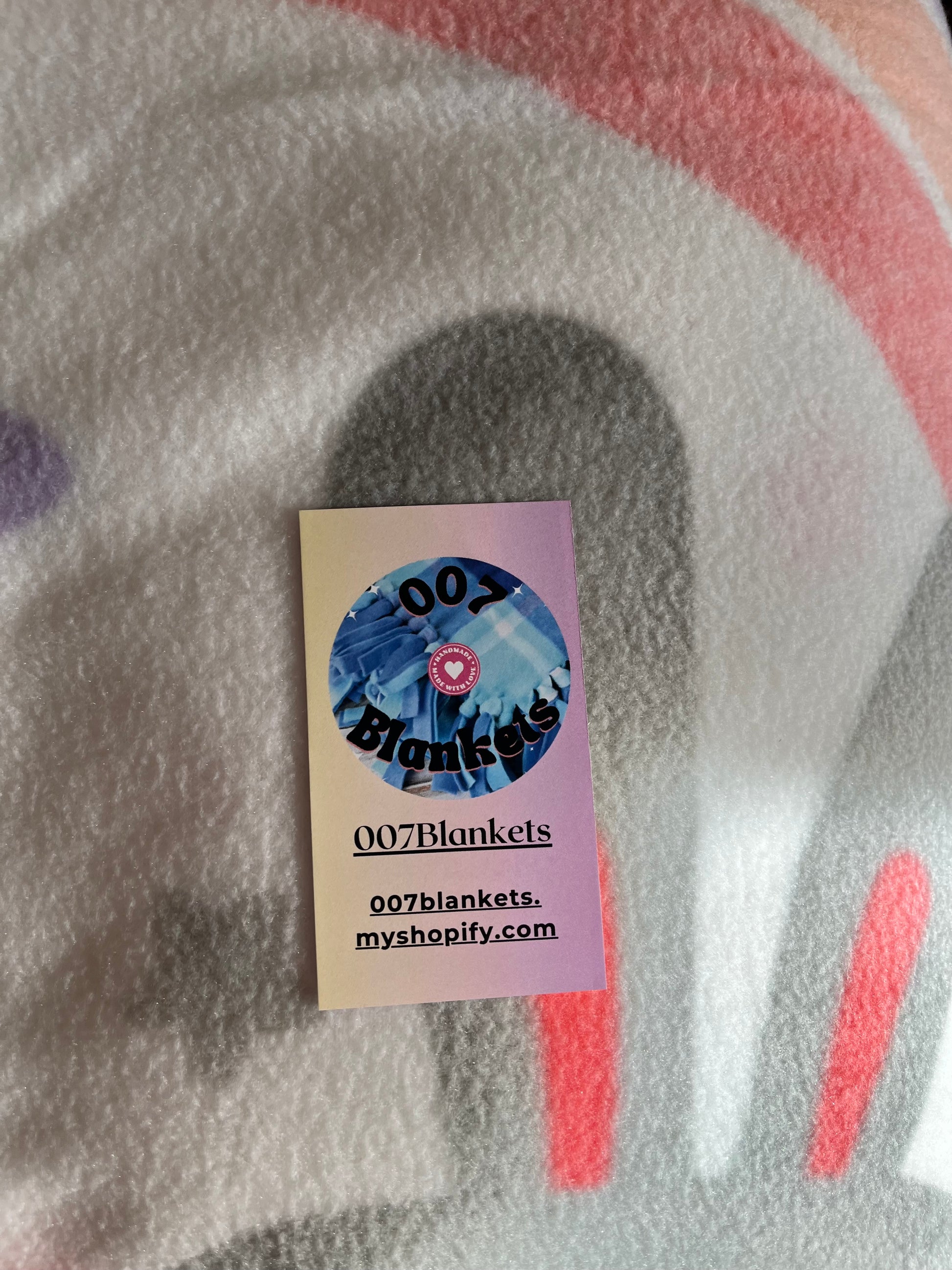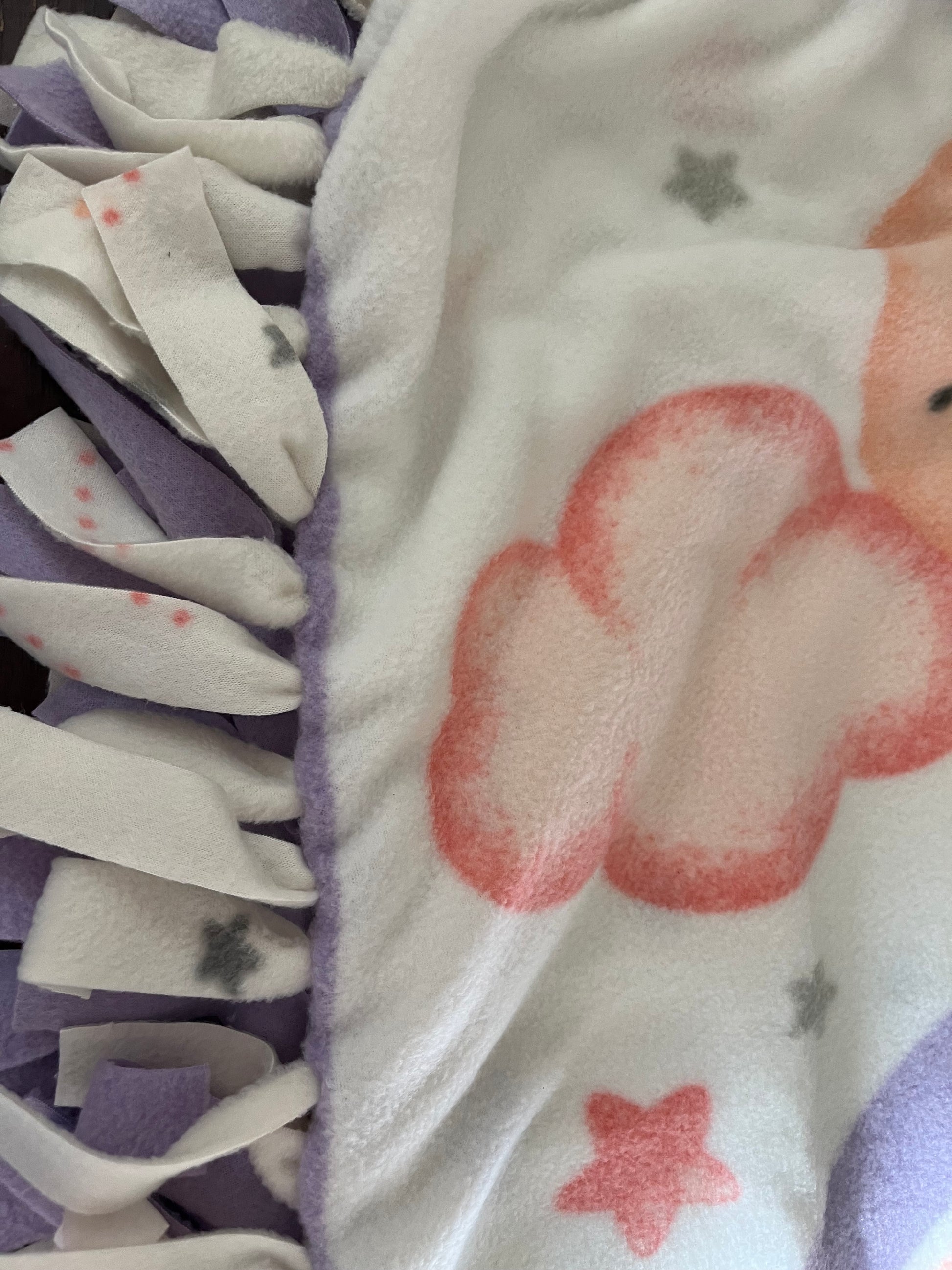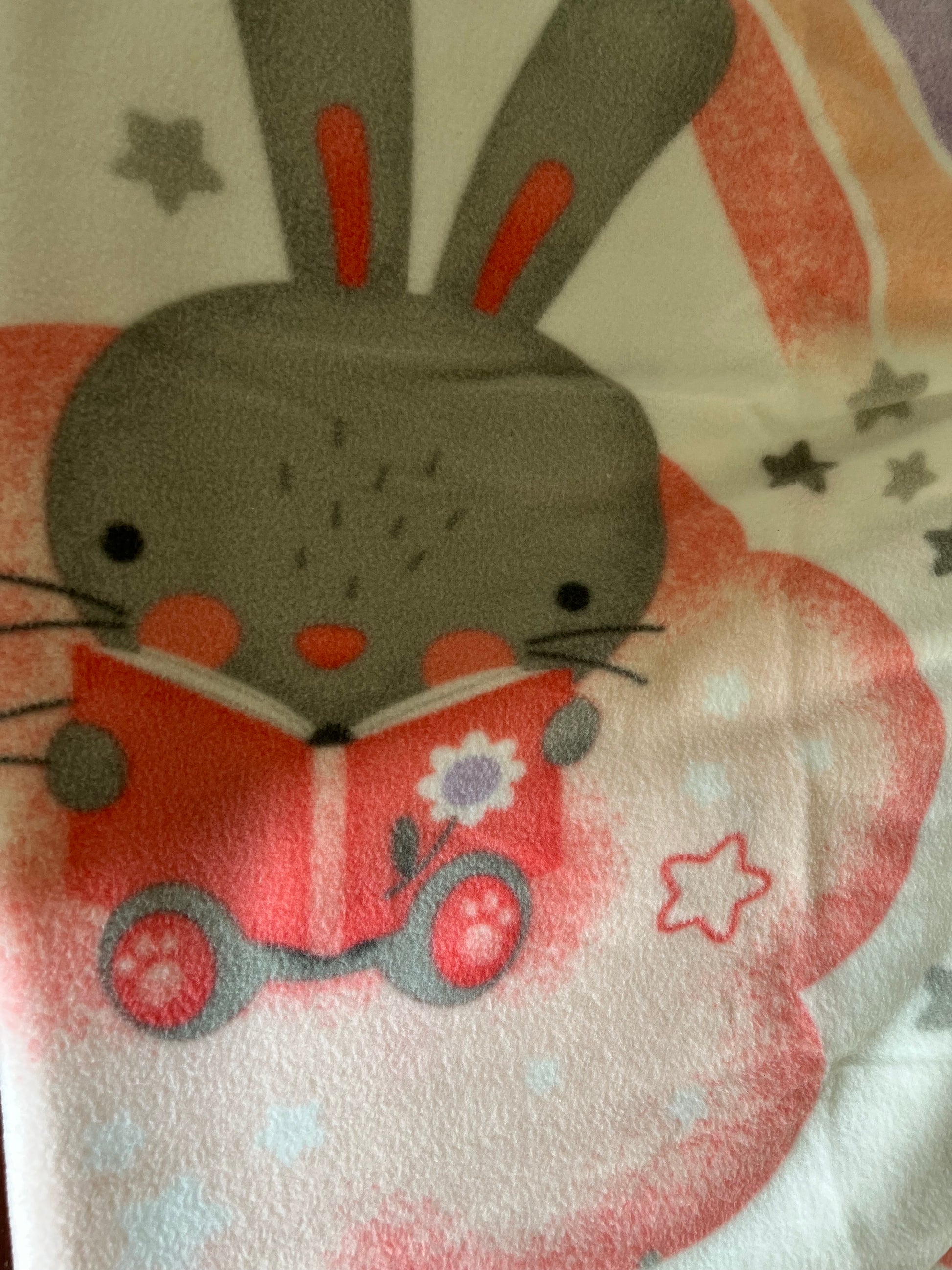 Blanket has 2 layers of fleece: Main picture ( 2 adorable bunnies on a pink cloud) other side is: white with cute stars and shapes.